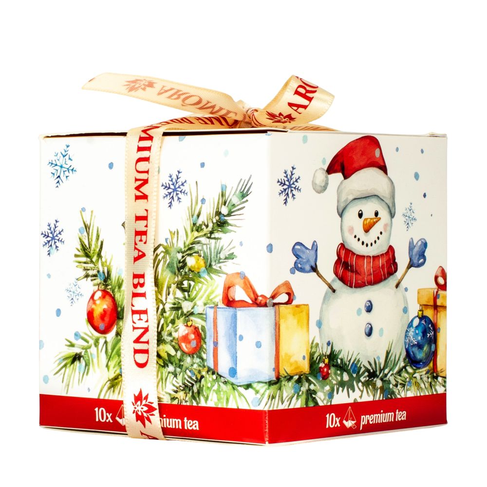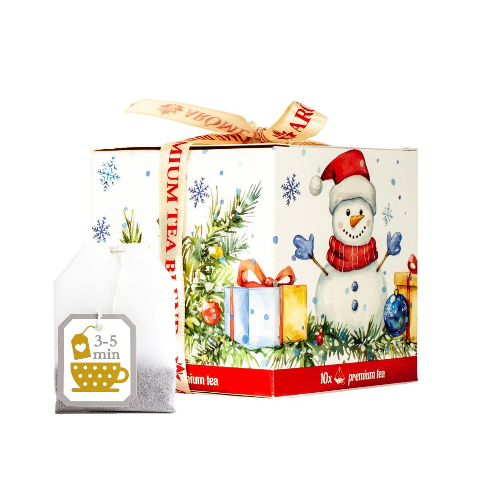 Lahodný černý čaj ze Srí Lanky se dvěma různými příchutěmi. Pyramidové čajové sáčky, 5 kusů od každé příchuti, jsou zabaleny v papírové krabičce s vánočním motivem a mašličkou.