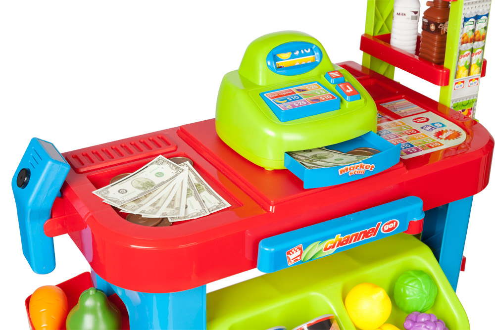 Dětský hrací stolek je klasický prodejní stánek se zeleninou, ovocem a sladkostmi. Součástí dětského stolku je pokladna s penězi, čtečka čárového kódu (s reálným zvukem) a košík na kolečkách pro zákazníka. Stačí jen vybalit, seskládat a může se začít prodávat. Součástí je velmi bohaté příslušenství pro prodej.