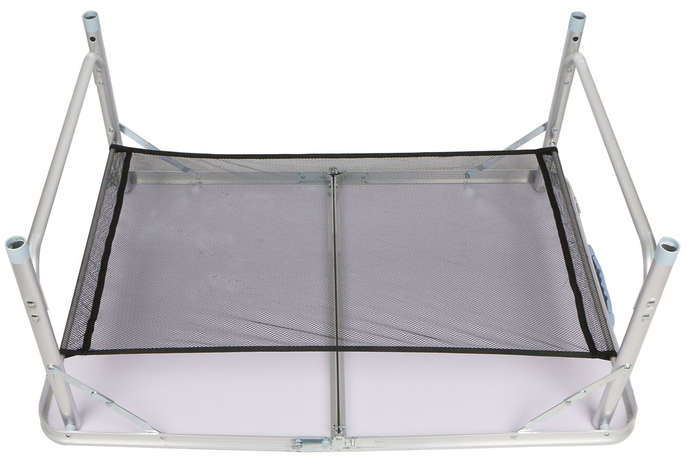 Kempingový stolek obdélníkového tvaru s praktickou síťovanou poličkou, vhodný na cestování, terasu nebo zahradu.