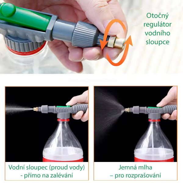 Nasadíte místo víčka na PET láhev, natlakujete pumpičkou a zmáčknutím spouště postřikujete.