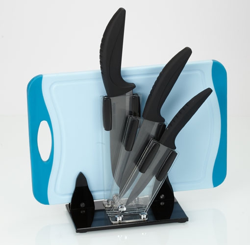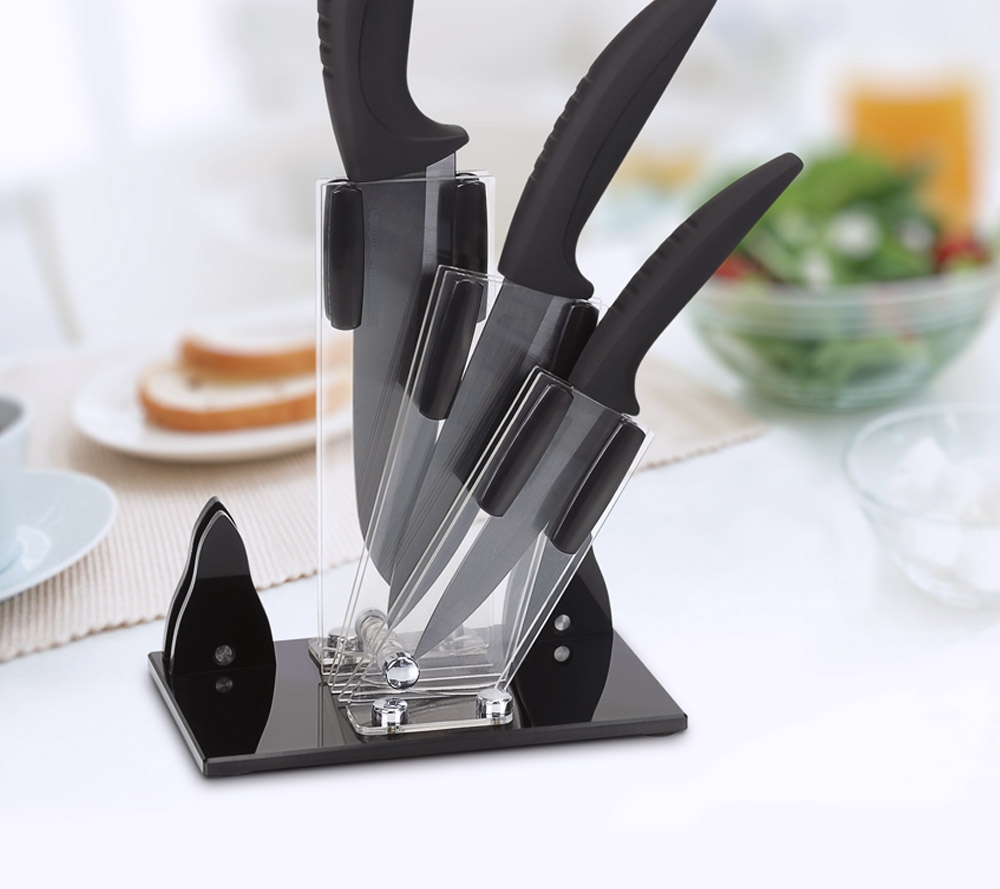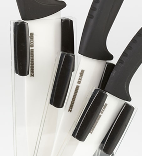 Stojánek na nože má 3 různě veliké přihrádky na nože, je ideální na keramické nože z naší nabídky - 1x univerzal + 1x chef + 1x gourmet.